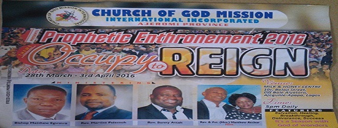 Enthronement refer to a ceremony marking a monarch's accession, generally distinguished from a coronation, so to be among Monarch, Kings, and Queen, come and Experience God's Power in CHURCH OF GOD MISSION INT'L (Ajeromi Province)